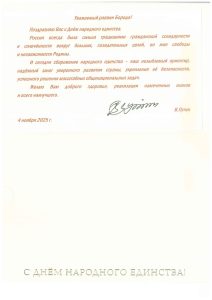 Президент РФ В.В. Путин направил поздравление с Днем народного единства